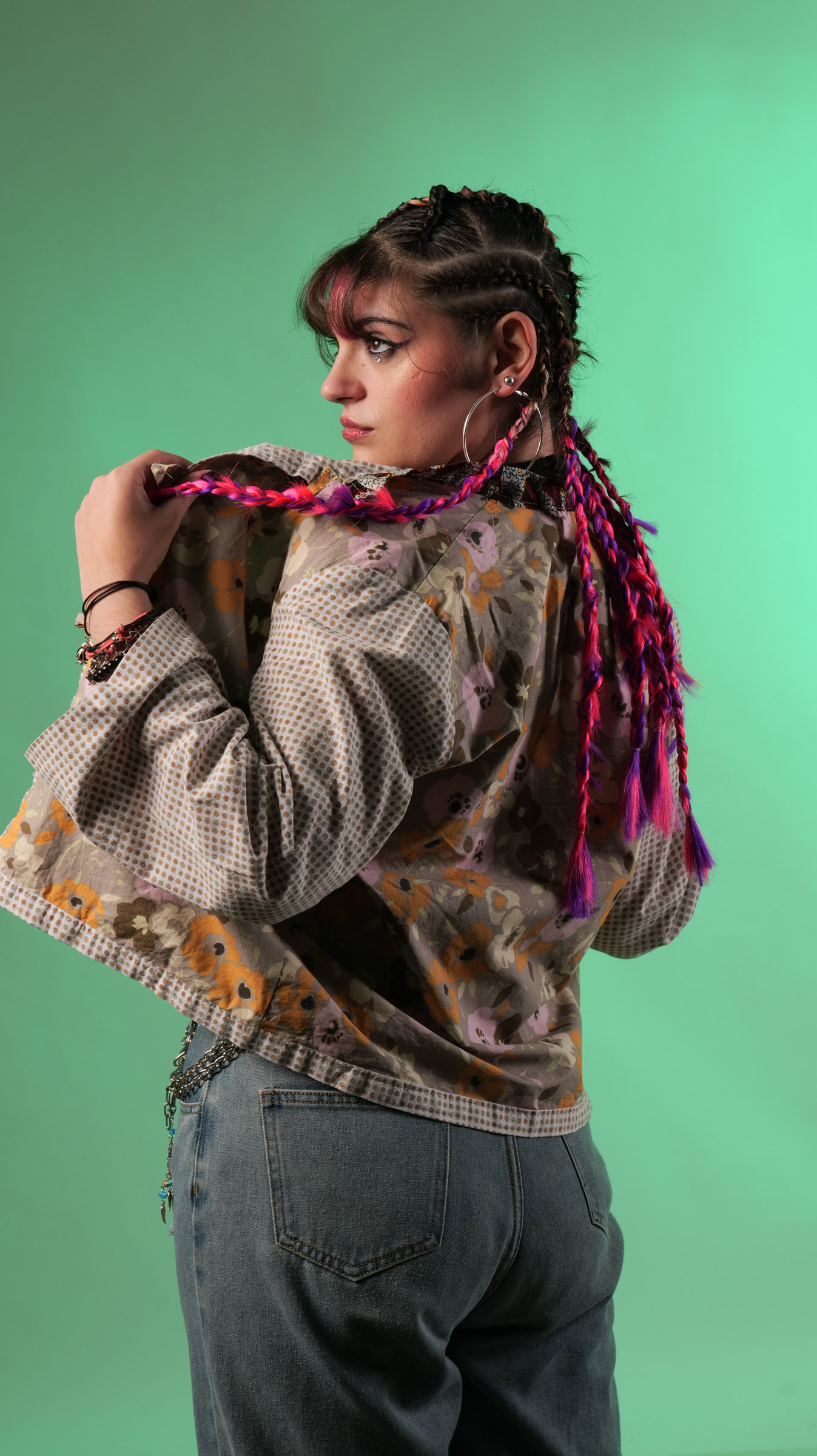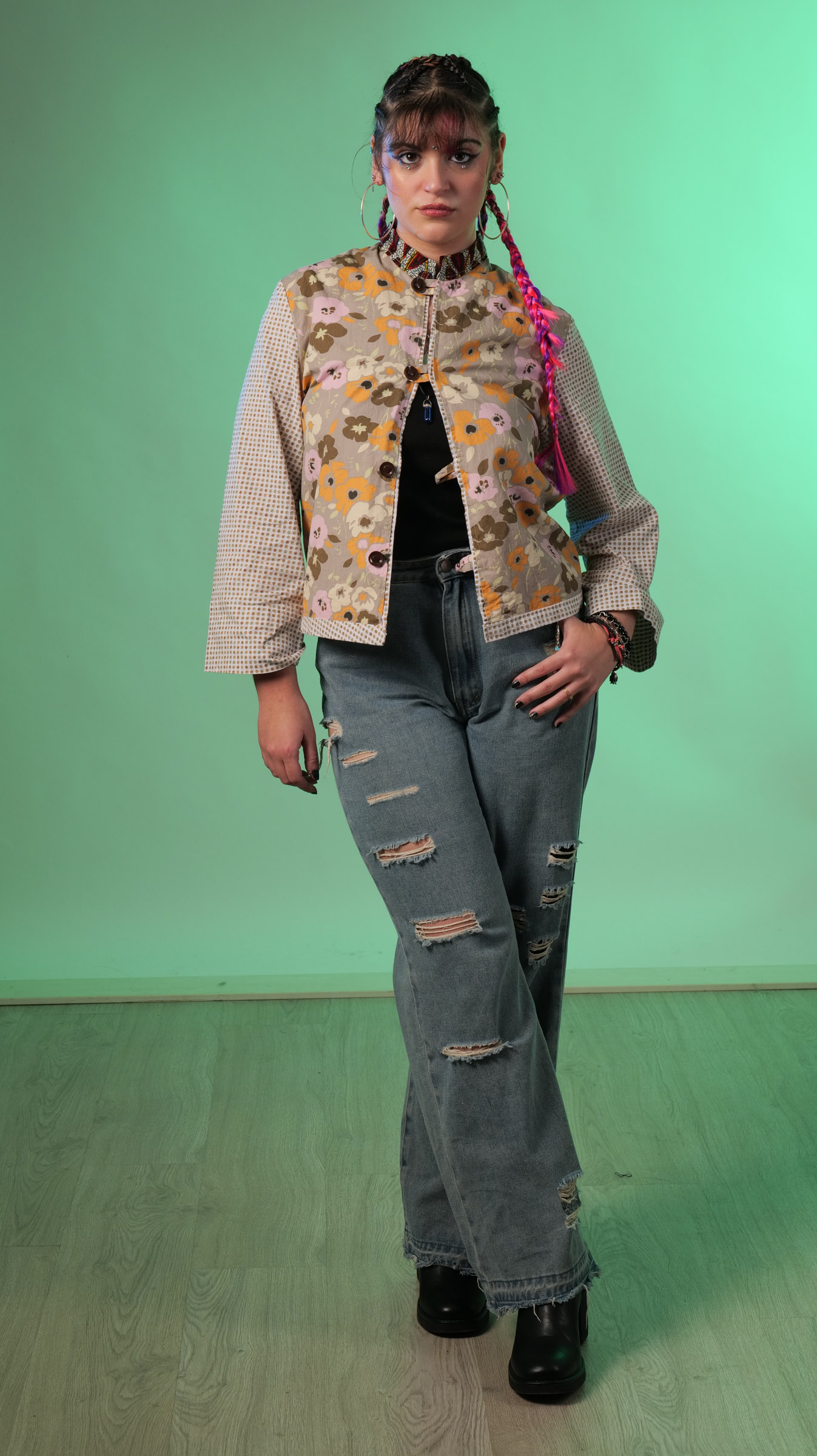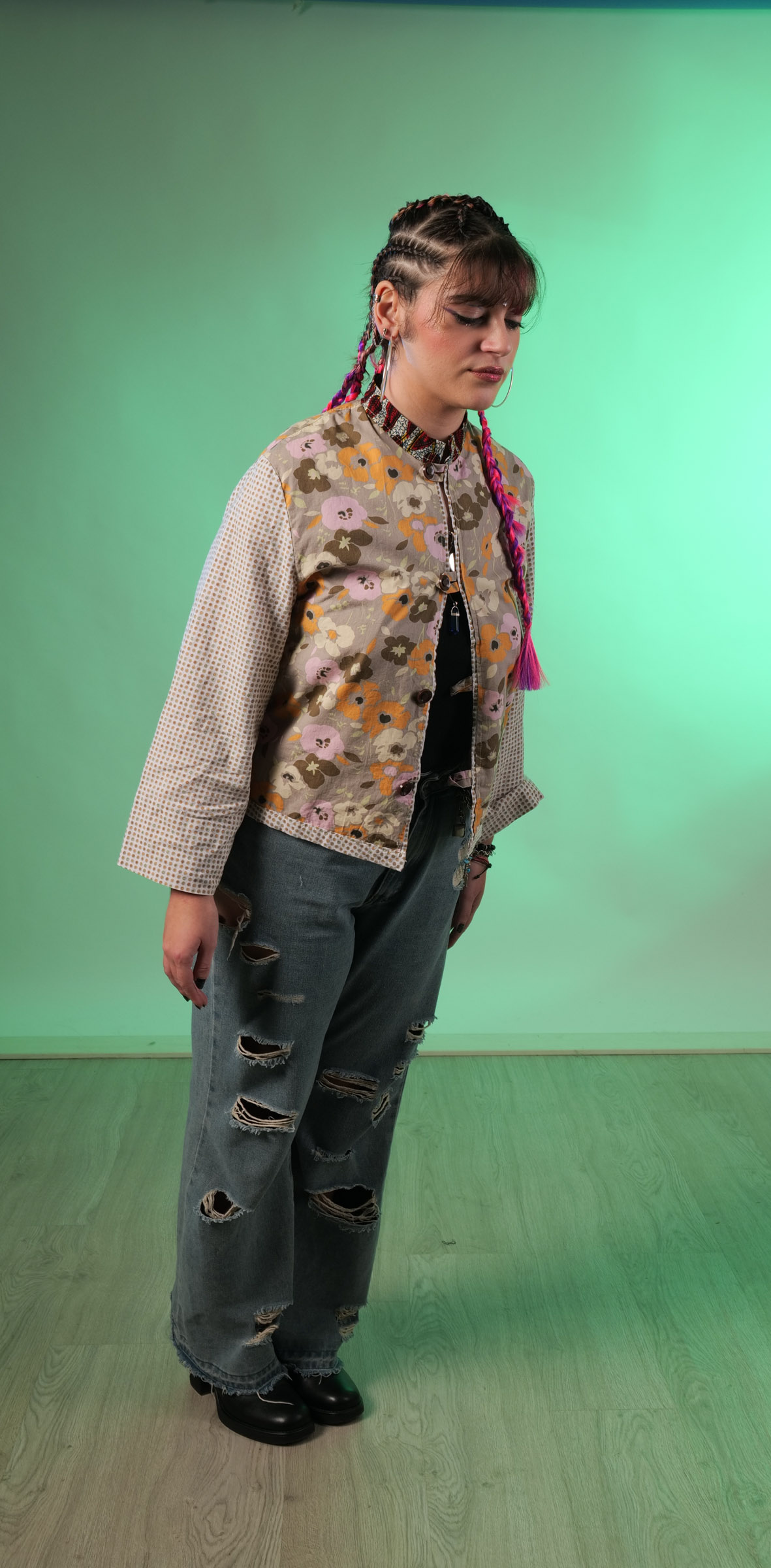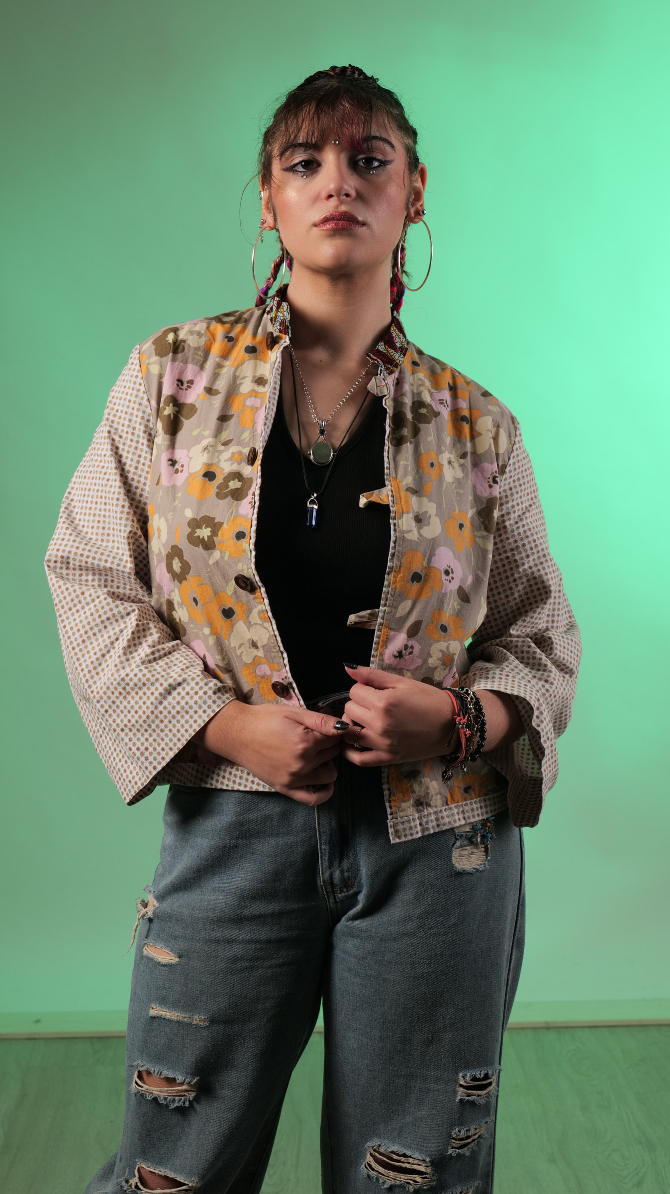 Esta chaquet kimono es una fusión de telas y estilos. El contraste de los estampados se complementan muy bien. Telas provenientes de una bata de andar por casa y un pantalón, el detalle del cuello era una camisa africana.