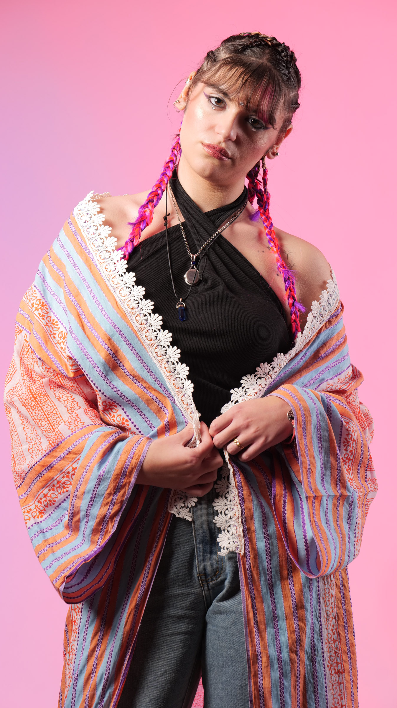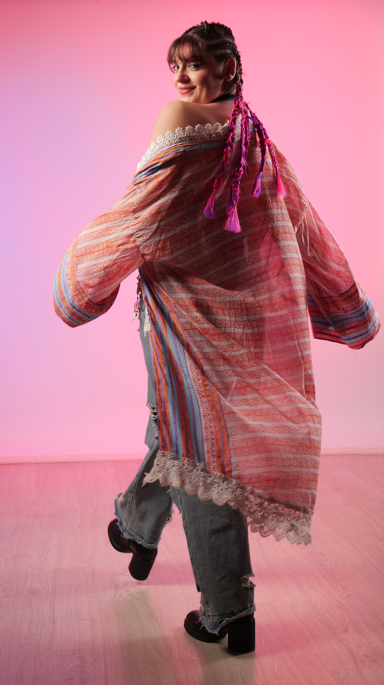 La historia propia de este Kimono a rayas : está compuesto por un sari (que me fue donado por mi amiga Tati) y el encaje del bajo es de una camisa, distinto al encaje mas barroco del cuello que procede de una blusa.